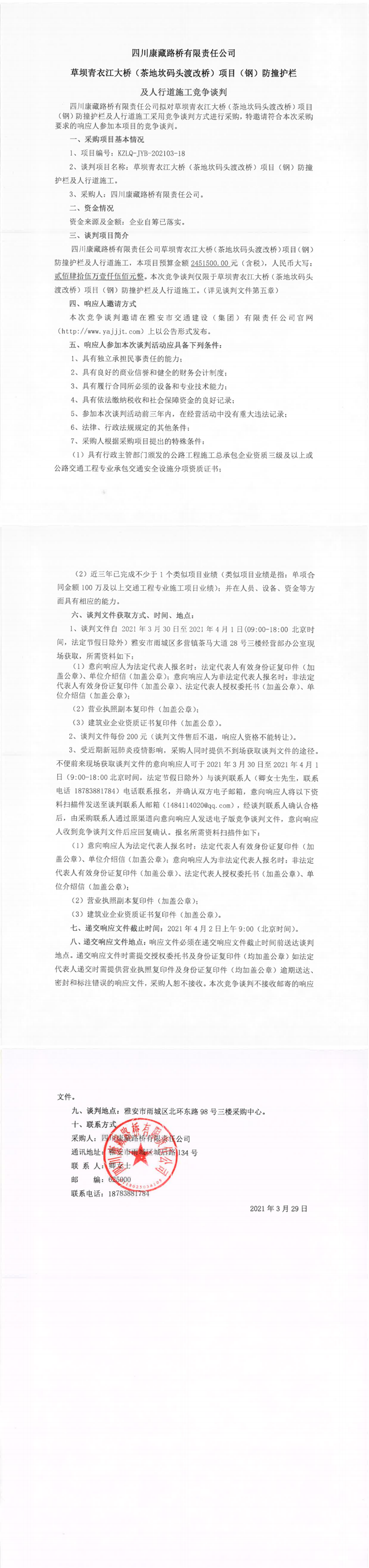 四川康藏路橋有限責任公司草壩青衣江大橋(茶地坎碼頭渡改橋)項目(鋼)防撞護欄及人行道施工競爭談判公告