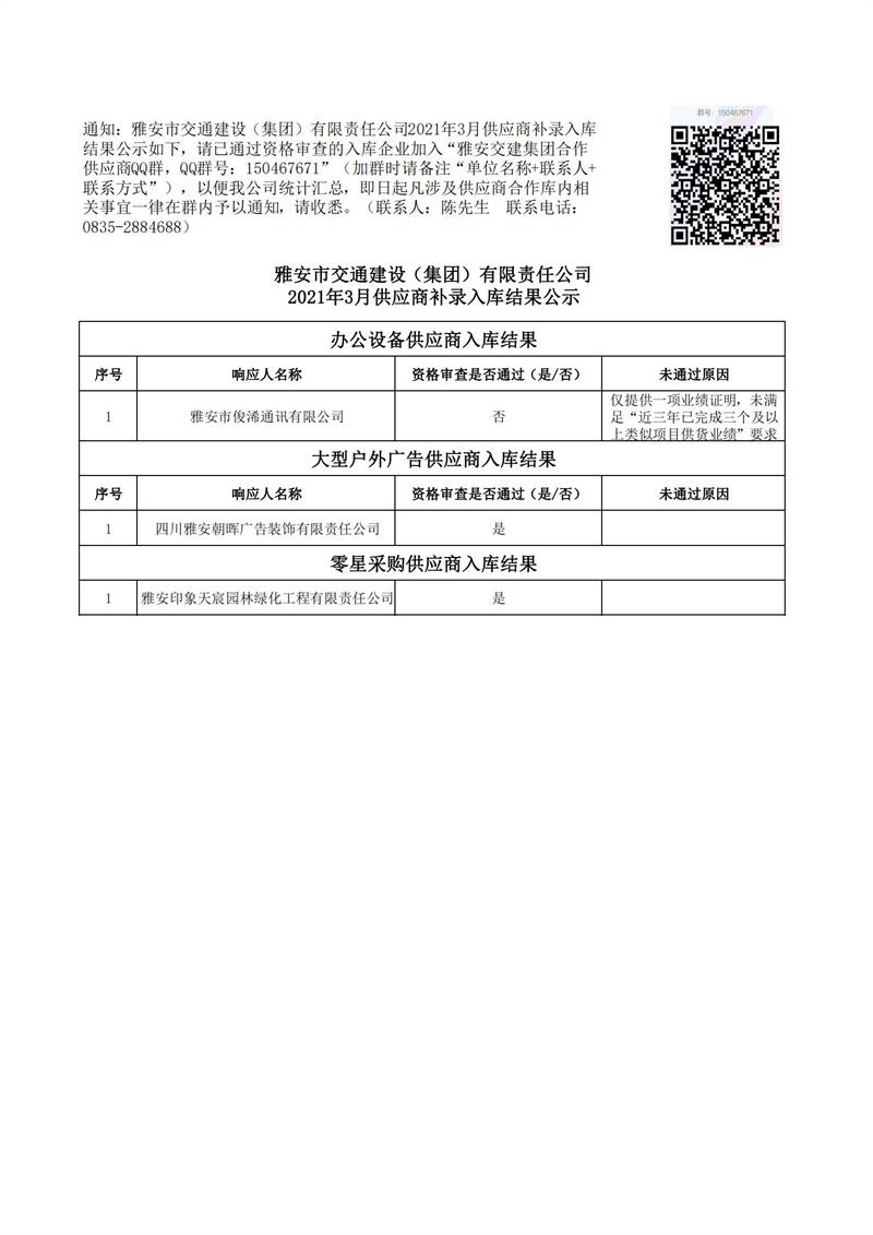 雅安市交通建設(集團)有限責任公司2021年3月供應商補錄入庫結果公示