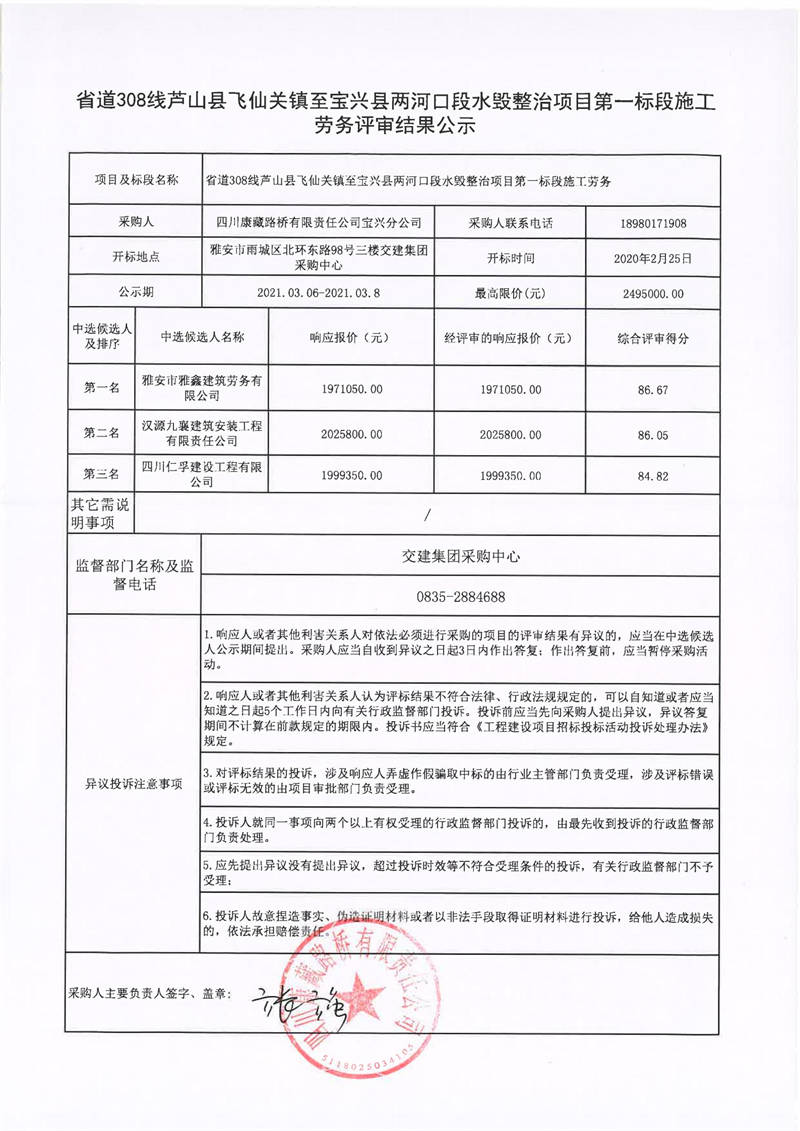 四川康藏路橋有限責(zé)任公司寶興分公司省道308線蘆山縣飛仙關(guān)鎮(zhèn)至寶興縣兩河口段水毀整治項目第一標(biāo)段施工勞務(wù)評審結(jié)果公示