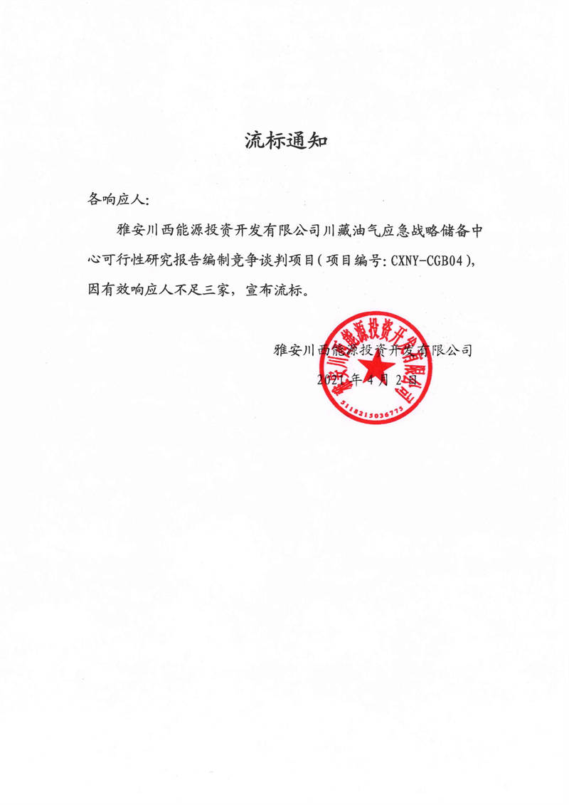 雅安川西能源投資開發(fā)有限公司川藏油氣應(yīng)急戰(zhàn)略儲備中心可行性研究報告編制競爭談判項目流標(biāo)通知