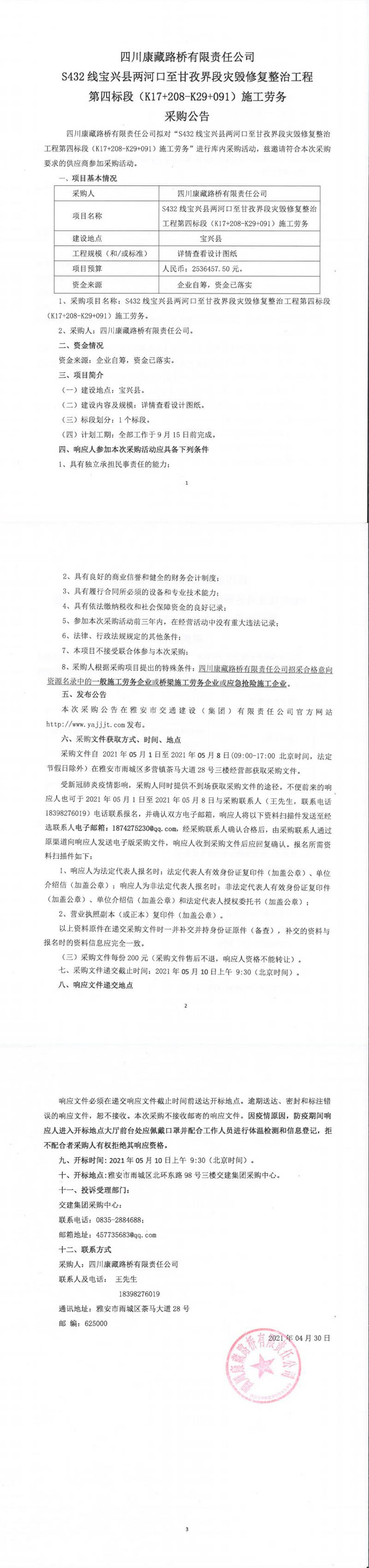 四川康藏路橋有限責任公司S432線寶興縣兩河口至甘孜界段災毀修復整治工程第四標段(K17+208-K29+091)施工勞務采購公告