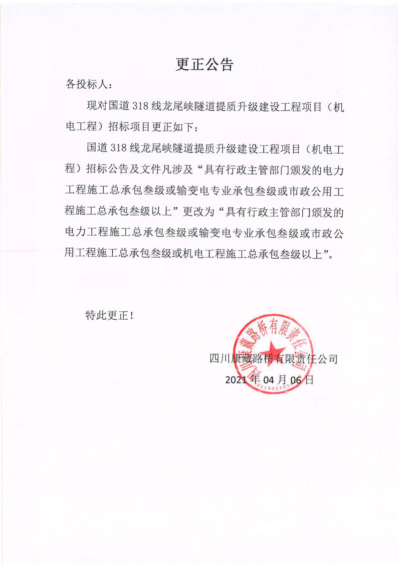 四川康藏路橋有限責(zé)任公司國(guó)道318線龍尾峽隧道提質(zhì)升級(jí)建設(shè)工程項(xiàng)目(機(jī)電工程)更正公告