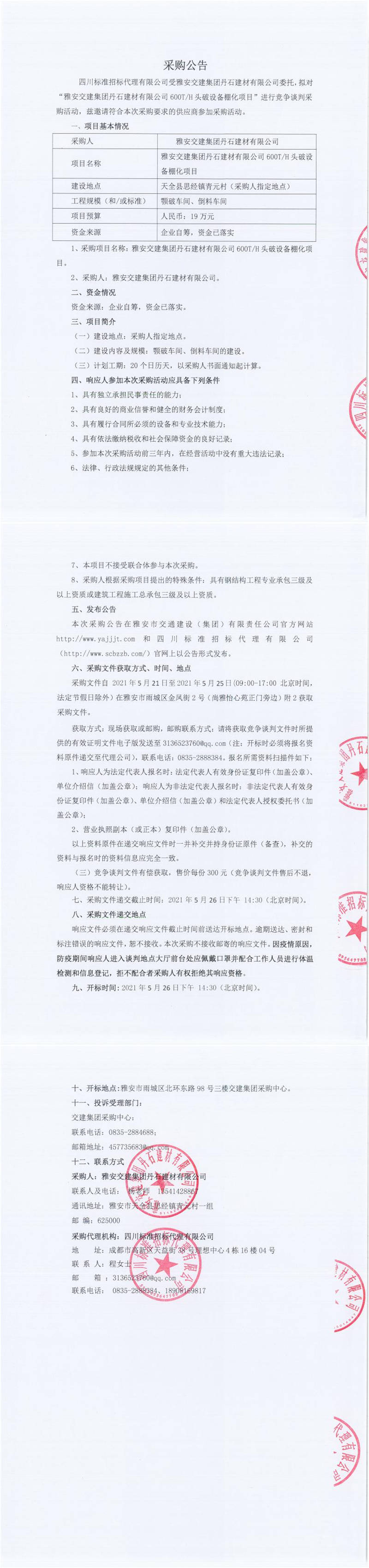 雅安交建集團(tuán)丹石建材有限公司600T/H頭破設(shè)備棚化項目競爭談判公告