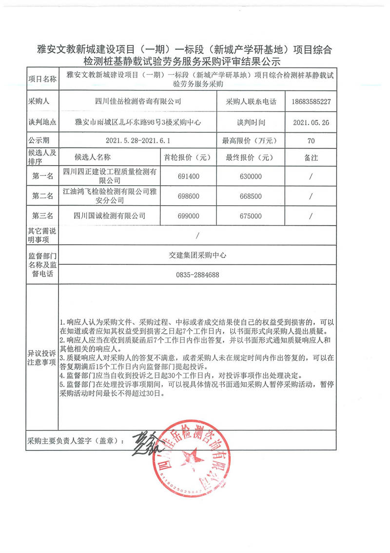 四川佳岳檢測咨詢有限公司雅安文教新城建設(shè)項(xiàng)目(一期)一標(biāo)段(新城產(chǎn)學(xué)研基地)項(xiàng)目綜合檢測樁基靜載試驗(yàn)勞務(wù)服務(wù)采購評審結(jié)果公示