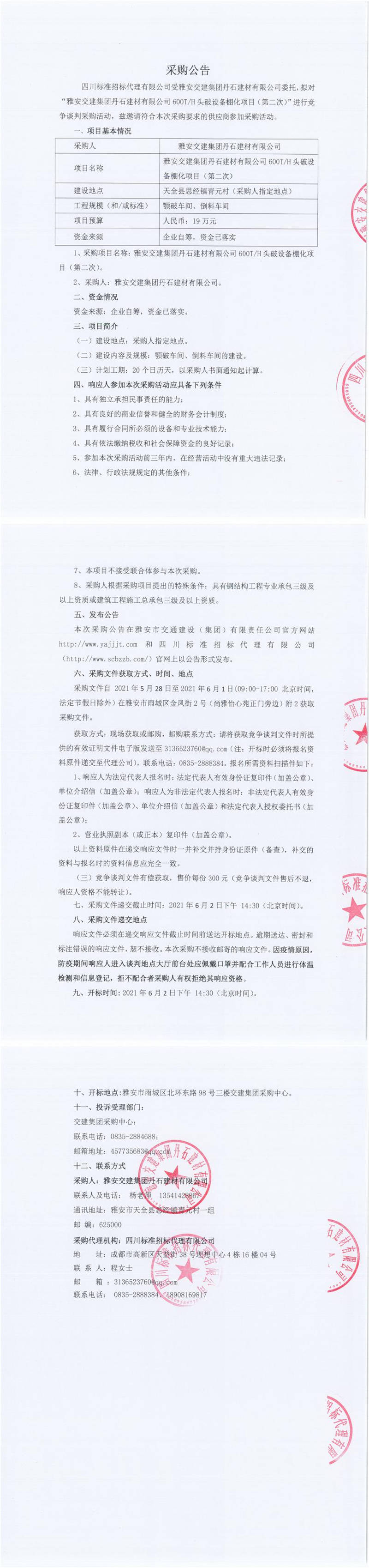 雅安交建集團(tuán)丹石建材有限公司600T/H頭破設(shè)備棚化項(xiàng)目(第二次)競(jìng)爭(zhēng)談判公告