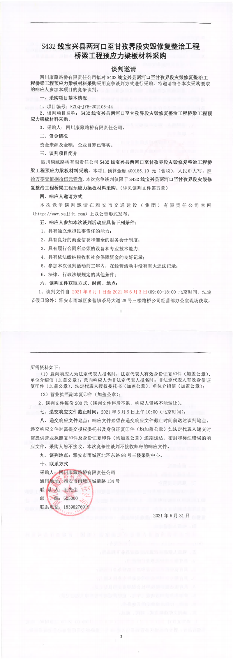 四川康藏路橋有限責(zé)任公司S432線寶興縣兩河口至甘孜界段災(zāi)毀修復(fù)整治工程橋梁工程預(yù)應(yīng)力梁板材料采購競(jìng)爭(zhēng)談判公告