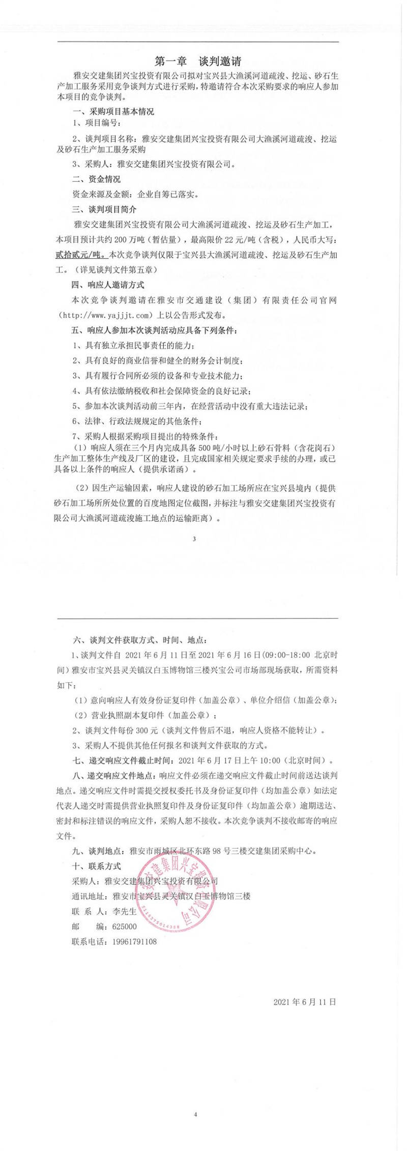 雅安交建集團(tuán)興寶投資有限公司大漁溪河道疏浚、挖運(yùn)及砂石生產(chǎn)加工服務(wù)采購(gòu)競(jìng)爭(zhēng)談判公告