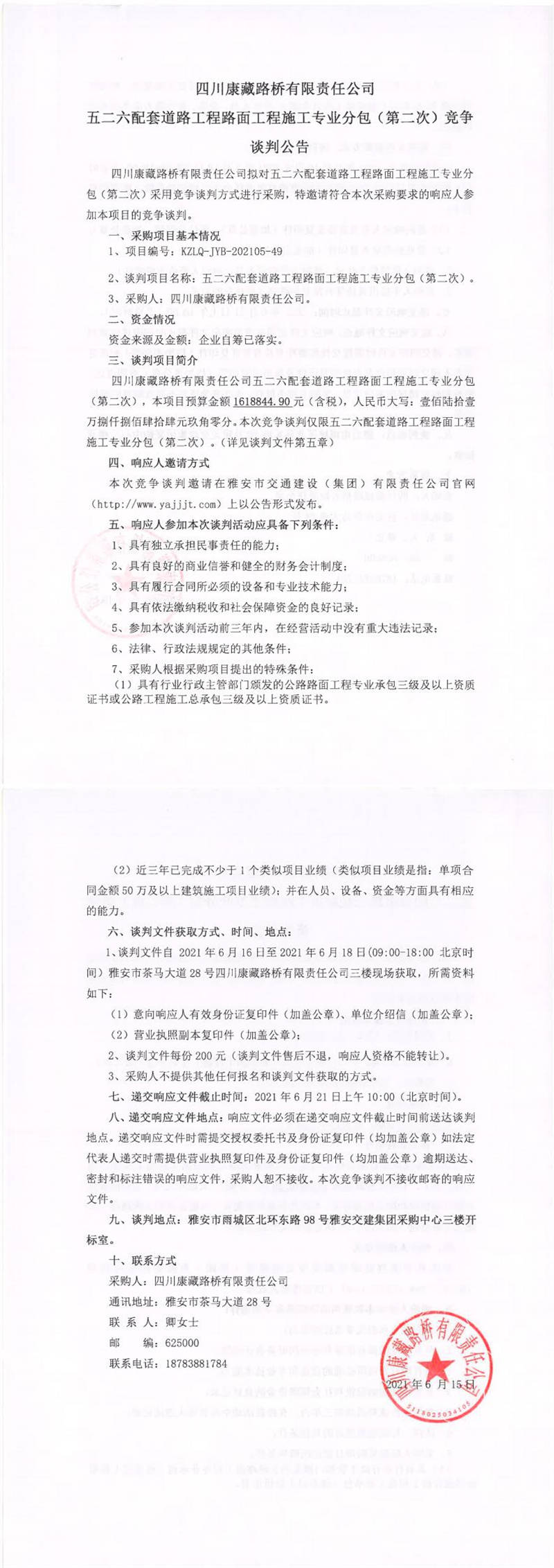 四川康藏路橋有限責(zé)任公司五二六配套道路工程路面工程施工專(zhuān)業(yè)分包(第二次)競(jìng)爭(zhēng)談判公告