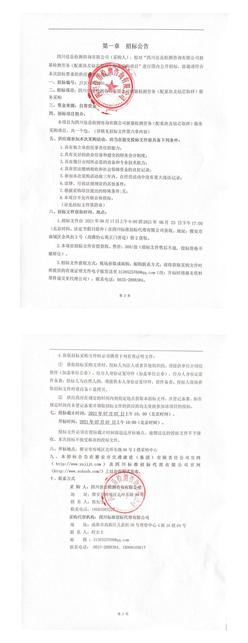 四川佳岳檢測咨詢有限公司樁基檢測勞務(wù)(配重塊及鉆芯取樣)服務(wù)采購招標公告