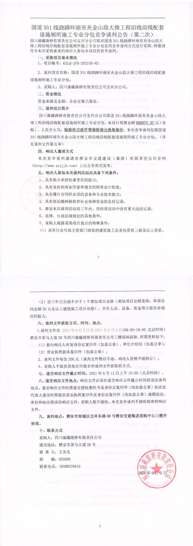 四川康藏路橋有限責(zé)任公司寶興分公司國道351線蹺磧環(huán)湖至夾金山段大修工程沿線沿線配套設(shè)施廁所施工專業(yè)分包競爭談判公告(第二次)