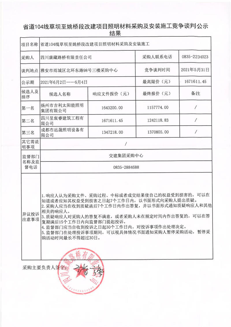 四川康藏路橋有限責任公司省道104線草壩至姚橋段改建項目照明材料采購及安裝施工競爭談判公示結(jié)果