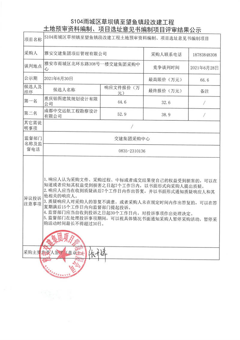 雅安交建集團(tuán)項(xiàng)目管理有限公司S104雨城區(qū)草壩鎮(zhèn)至望魚(yú)鎮(zhèn)段改建工程土地預(yù)審資料編制、項(xiàng)目選址意見(jiàn)書(shū)編制項(xiàng)目評(píng)審結(jié)果公示