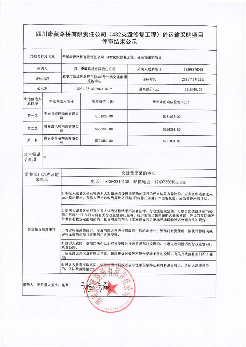 四川康藏路橋有限責(zé)任公司S432線寶興縣兩河口至甘孜界段災(zāi)毀修復(fù)整治工程砼運(yùn)輸采購項(xiàng)目評(píng)審結(jié)果公示