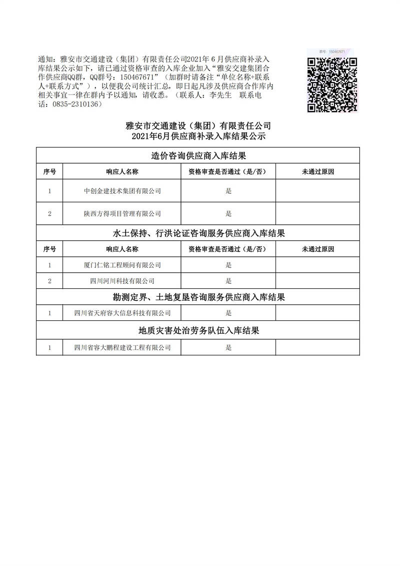 雅安市交通建設(集團)有限責任公司2021年6月供應商補錄入庫結(jié)果公示