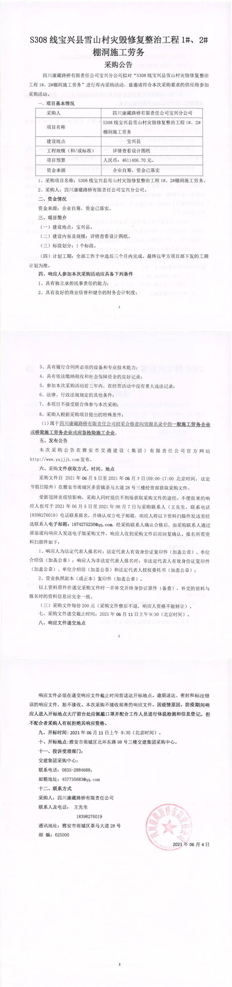 四川康藏路橋有限責任公司S308線寶興縣雪山村災(zāi)毀修復整治工程1#、2#棚洞施工勞務(wù)采購公告