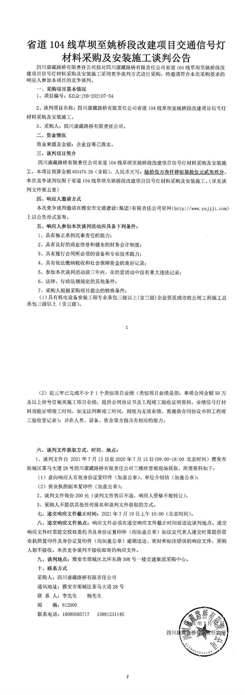 四川康藏路橋有限責(zé)任公司省道104線(xiàn)草壩至姚橋段改建項(xiàng)目交通信號(hào)燈材料采購(gòu)及安裝施工競(jìng)爭(zhēng)談判公告