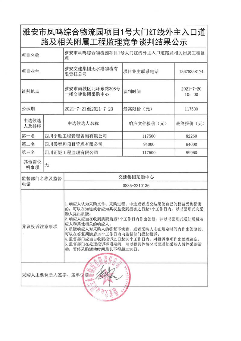雅安交建集團(tuán)無水港物流有限責(zé)任公司雅安市鳳鳴綜合物流園項(xiàng)目1號(hào)大門紅線外主入口道路及相關(guān)附屬工程監(jiān)理競爭談判結(jié)果公示
