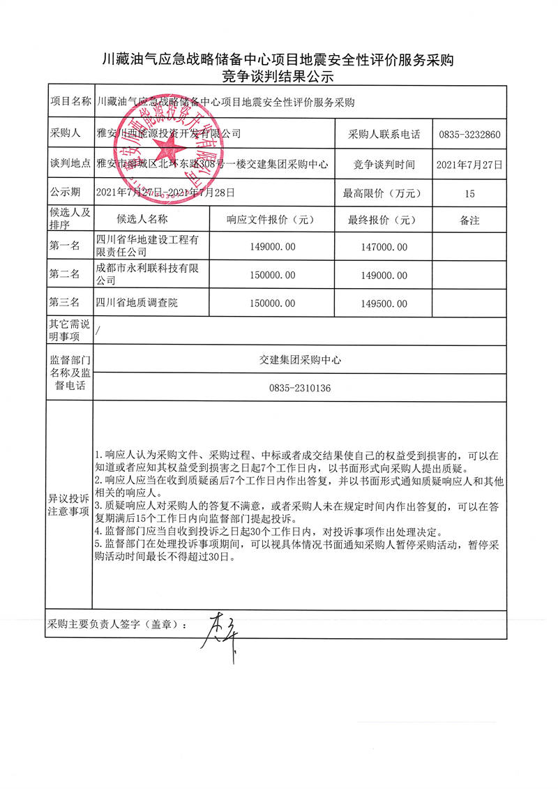 雅安川西能源投資開發(fā)有限公司川藏油氣應急戰(zhàn)略儲備中心項目地震安全性評價服務采購競爭談判結果公示