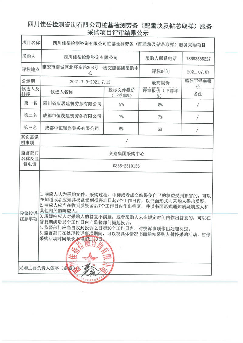 四川佳岳檢測咨詢有限公司樁基檢測勞務(配重塊及鉆芯取樣)服務采購項目評審結(jié)果公示