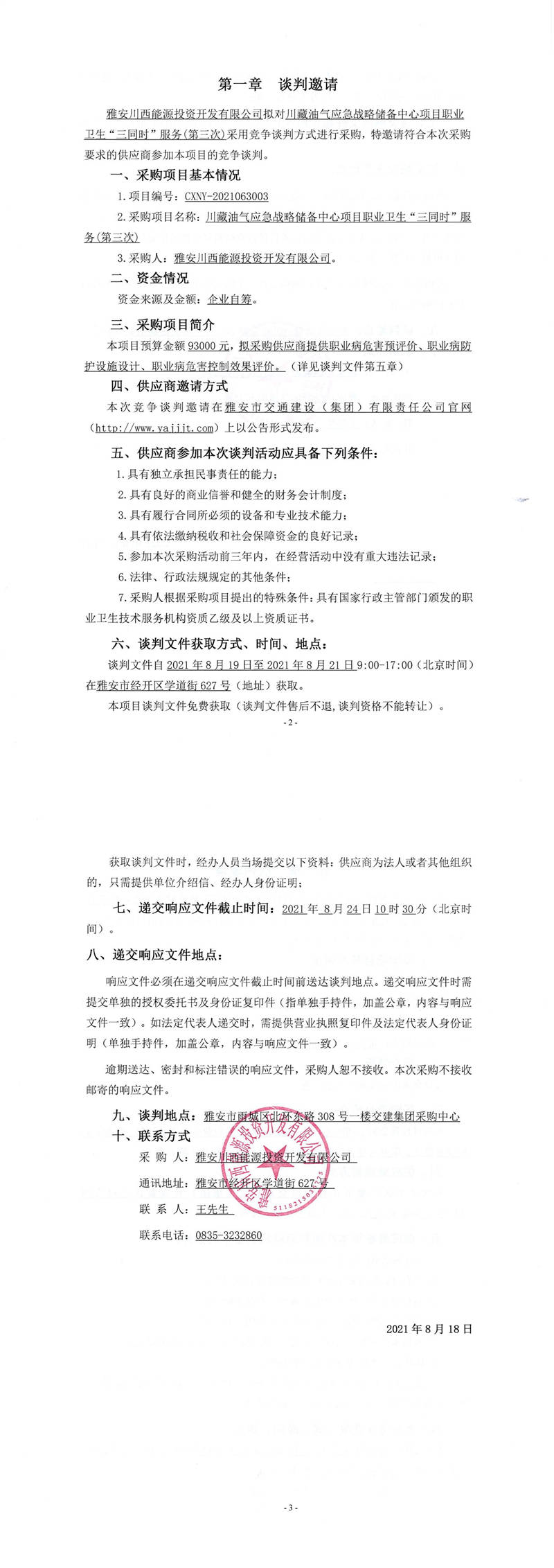 雅安川西能源投資開(kāi)發(fā)有限公司川藏油氣應(yīng)急戰(zhàn)略?xún)?chǔ)備中心項(xiàng)目職業(yè)衛(wèi)生“三同時(shí)”服務(wù)(第三次)競(jìng)爭(zhēng)談判