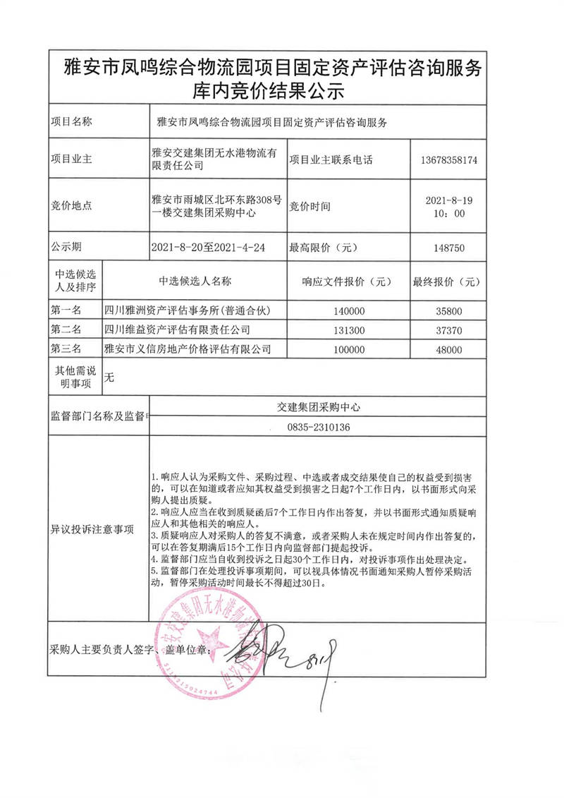 雅安交建集團(tuán)無水港物流有限責(zé)任公司雅安市鳳鳴綜合物流園項目固定資產(chǎn)評估咨詢服務(wù)庫內(nèi)競價結(jié)果公示