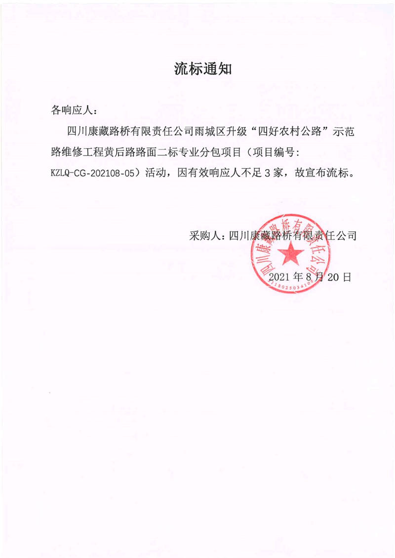 四川康藏路橋有限責任公司雨城區(qū)升級“四好農(nóng)村公路”示范路維修工程黃后路路面二標專業(yè)分包項目流標通知