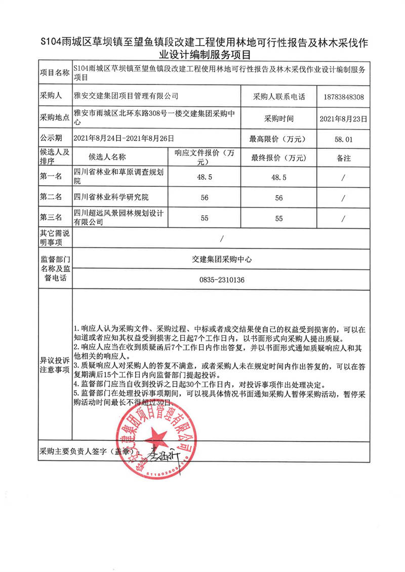 雅安交建集團(tuán)項(xiàng)目管理有限公司S104雨城區(qū)草壩鎮(zhèn)至望魚(yú)鎮(zhèn)段改建工程使用林地可行性報(bào)告及林木采伐作業(yè)設(shè)計(jì)編制服務(wù)項(xiàng)目評(píng)審結(jié)果公示