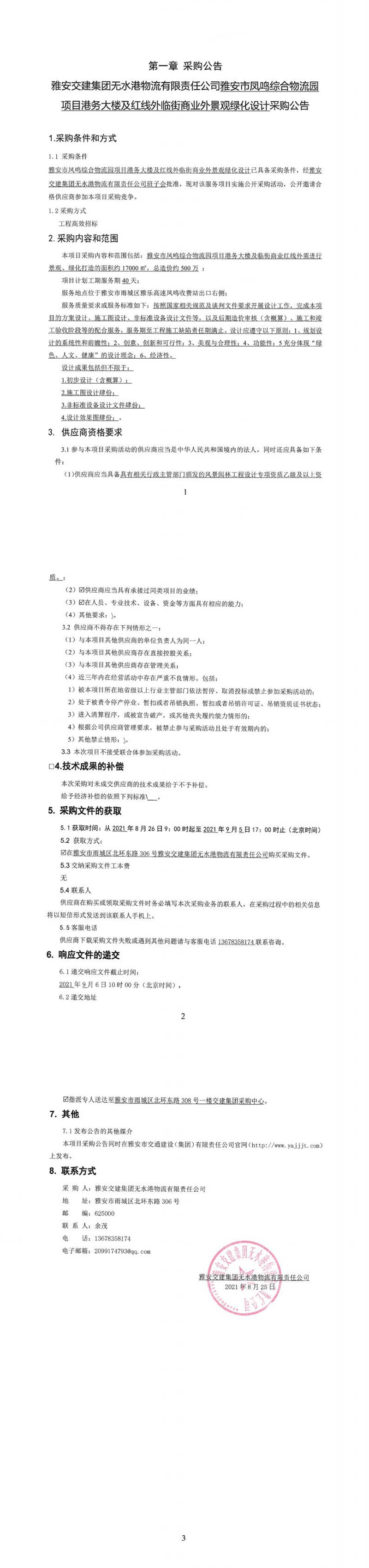雅安交建集團(tuán)無水港物流有限責(zé)任公司雅安市鳳鳴綜合物流園項目港務(wù)大樓及紅線外臨街商業(yè)外景觀綠化設(shè)計采購公告
