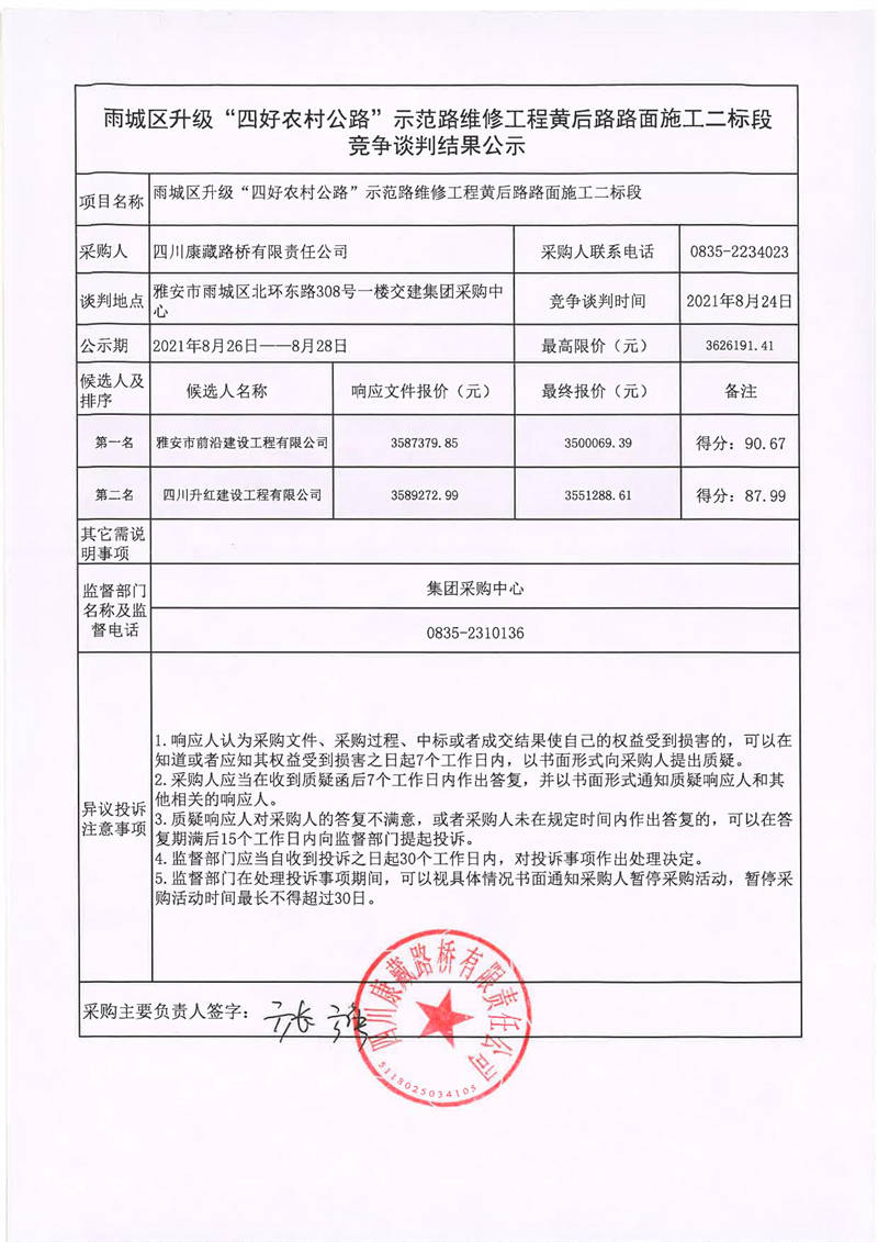 四川康藏路橋有限責任公司雨城區(qū)升級“四好農(nóng)材公路”示范路維修工程黃后路路面施工二標段競爭談判結(jié)果公示