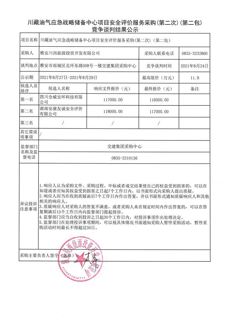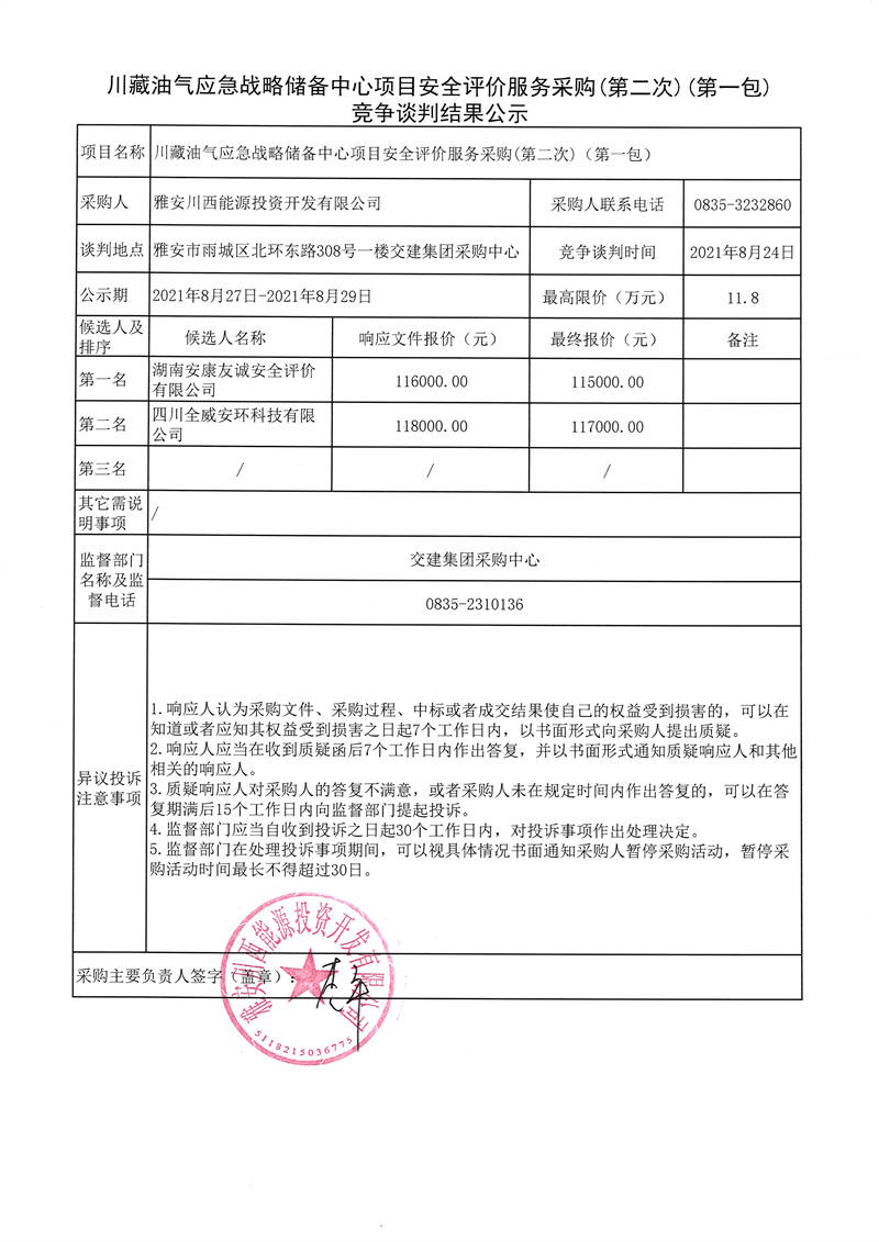 川藏油氣應急戰(zhàn)略儲備中心項目安全評價服務采購(第二次)(第一包、第二包)競爭談判結果公示