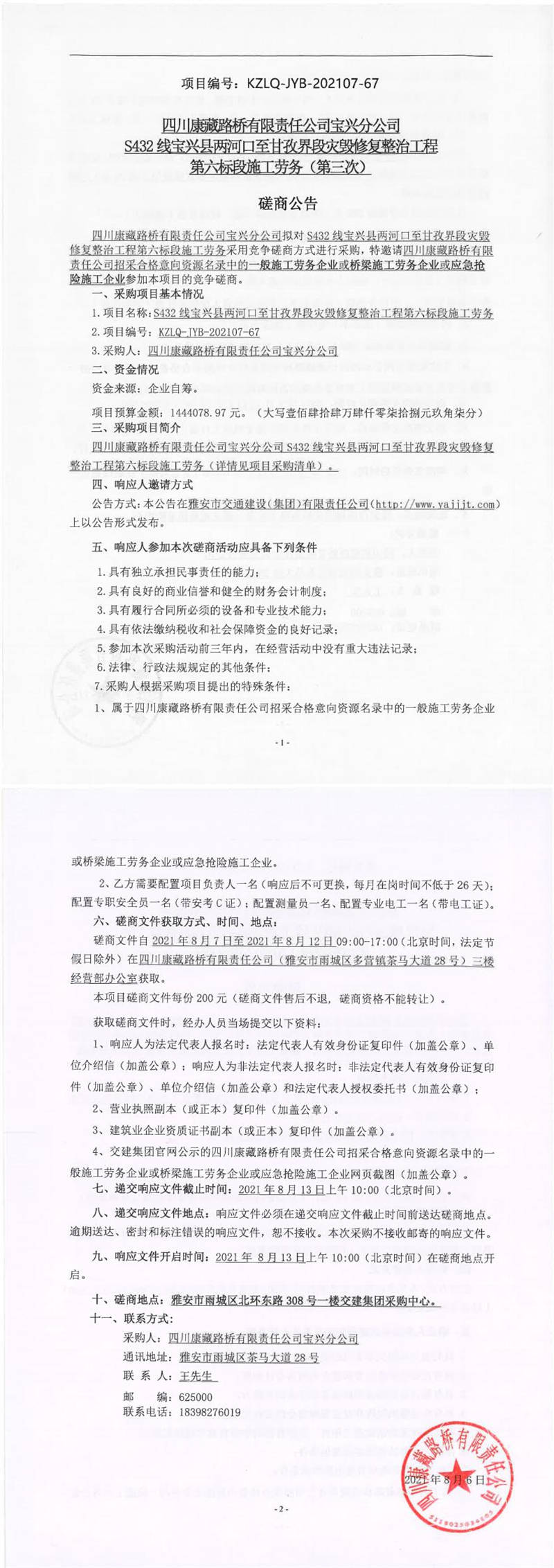 四川康藏路橋有限責(zé)任公司寶興分公司S432線寶興縣兩河口至甘孜界段災(zāi)毀修復(fù)整治工程第六標(biāo)段施工勞務(wù)(第三次)競爭磋商公告