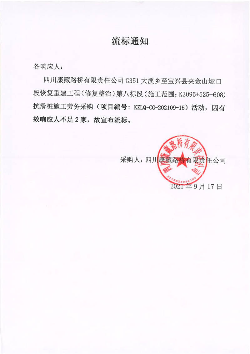 四川康藏路橋有限責(zé)任公司G351大溪鄉(xiāng)至寶興縣夾金山埡口段恢復(fù)重建工程(修復(fù)整治)第八標(biāo)段(施工范圍:K3095+525-608)抗滑樁施工勞務(wù)采購流標(biāo)通知