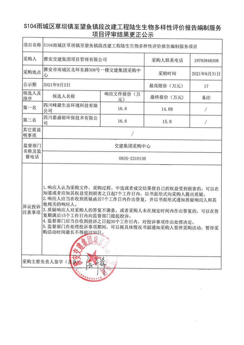 雅安交建集團項目管理有限公司S104雨城區(qū)草壩鎮(zhèn)至望魚鎮(zhèn)段改建工程陸生生物多樣性評價報告編制服務項目評審結果更正公示