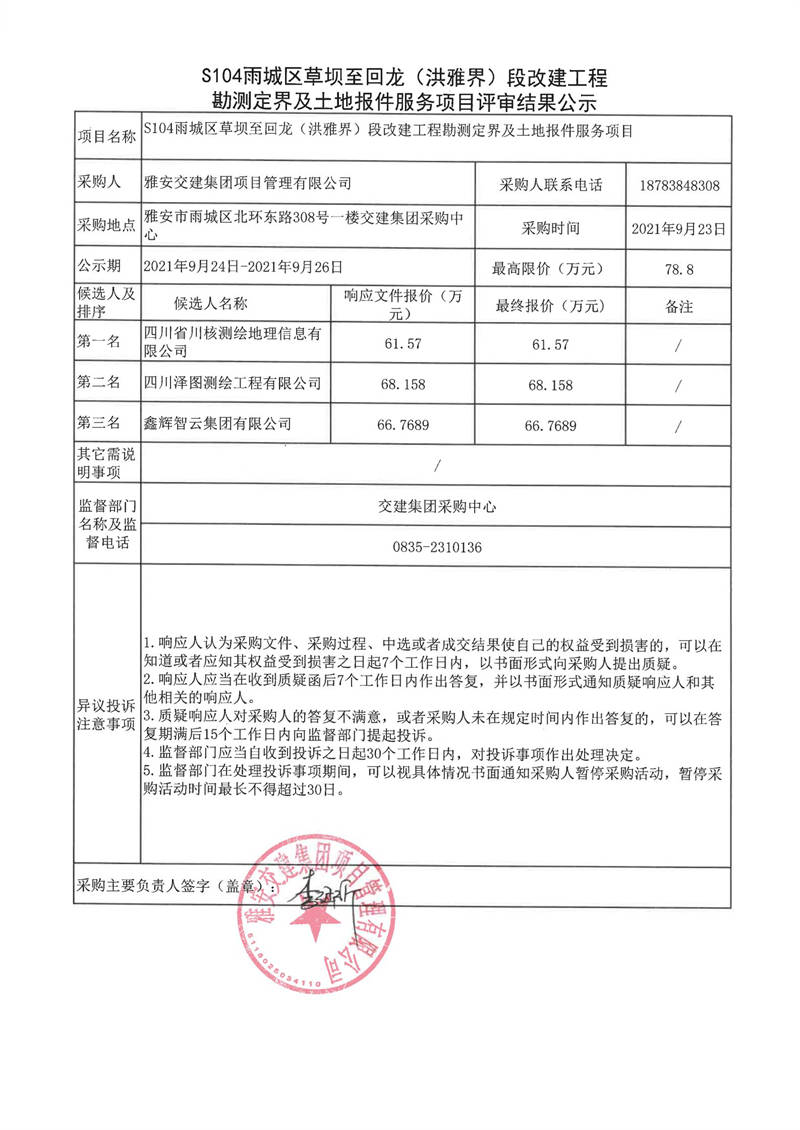 雅安交建集團(tuán)項(xiàng)目管理有限公司S104雨城區(qū)草壩至回龍(洪雅界)段改建工程勘測定界及土地報(bào)件服務(wù)項(xiàng)目評(píng)審結(jié)果公示