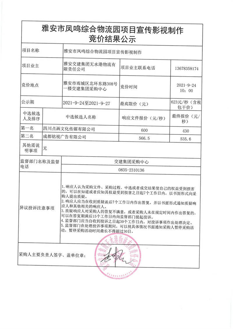 雅安交建集團(tuán)無水港物流有限責(zé)任公司雅安市鳳鳴綜合物流園項(xiàng)目宣傳影視制作競價(jià)結(jié)果公示