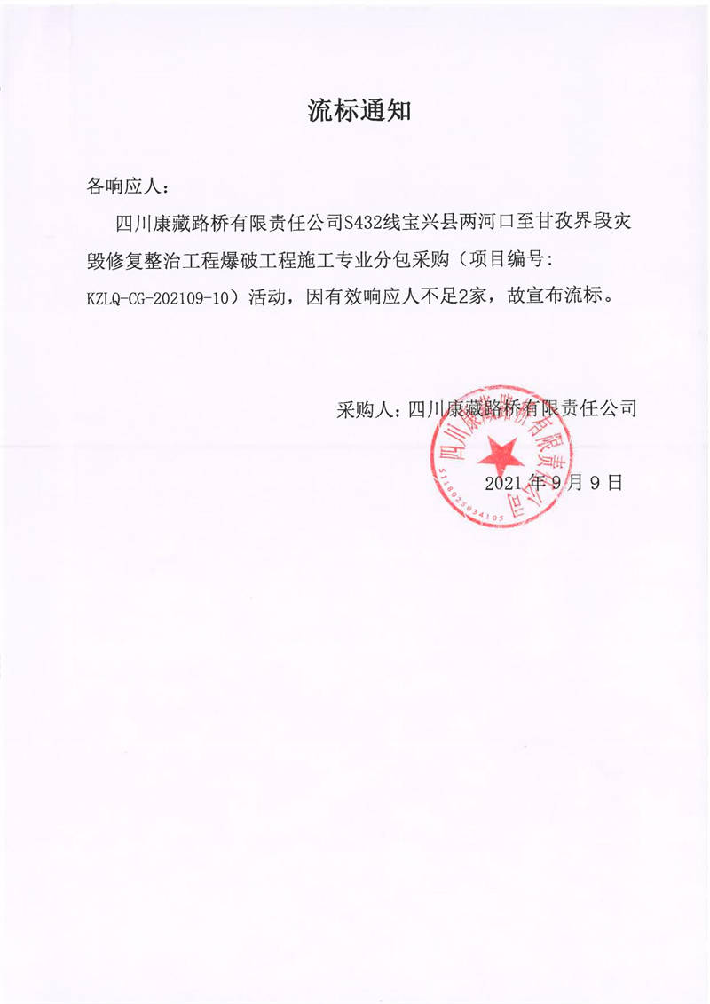 四川康藏路橋有限責(zé)任公司S432線寶興縣兩河口至甘孜界段災(zāi)毀修復(fù)整治工程爆破工程施工專業(yè)分包采購(gòu)流標(biāo)通知