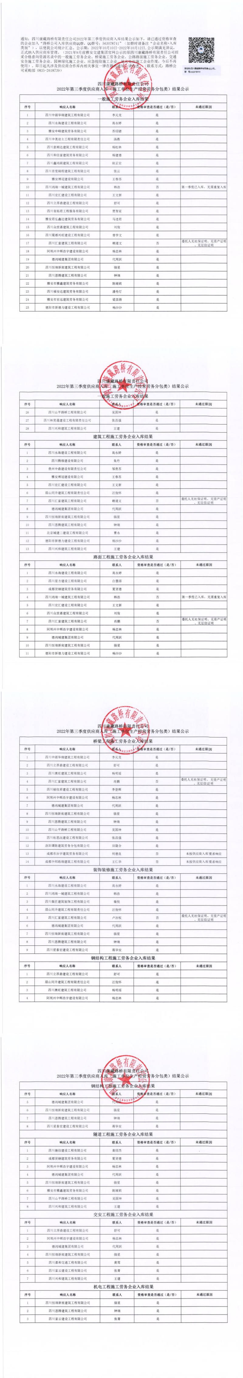 四川康藏路橋有限責任公司2022年第三季度供應商入庫(施工單位生產(chǎn)經(jīng)營勞務分包類)結(jié)果公示