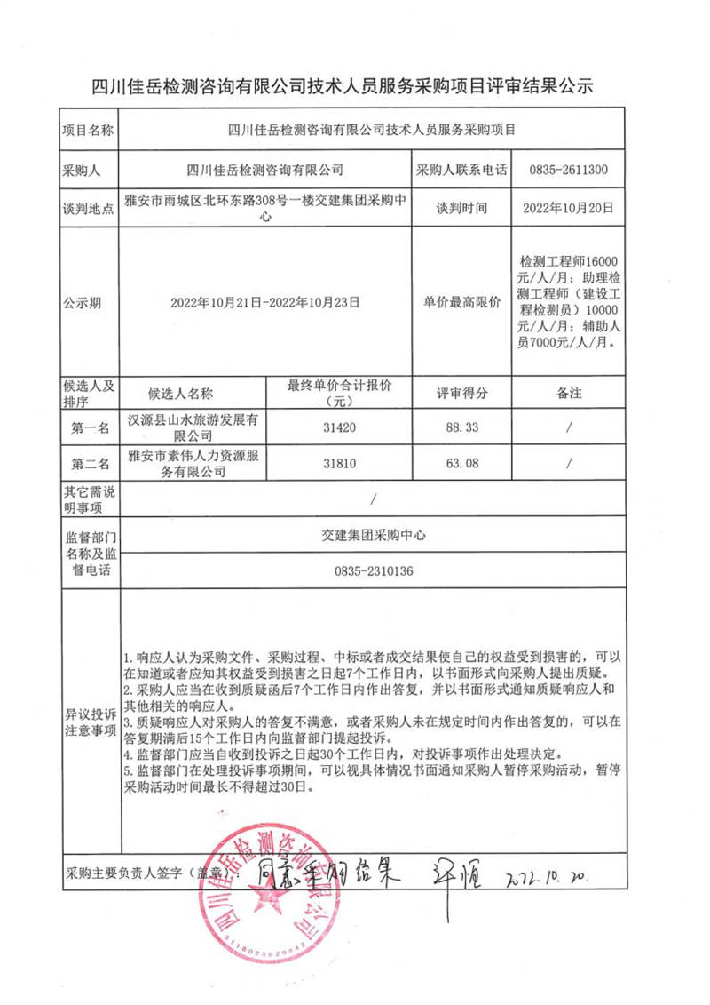 四川佳岳檢測咨詢有限公司技術(shù)人員服務(wù)采購項(xiàng)目評審結(jié)果公示