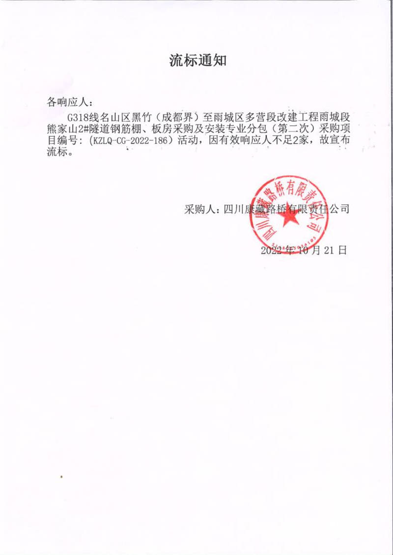 四川康藏路橋有限責(zé)任公司G318線名山區(qū)黑竹(成都界)至雨城區(qū)多營段改建工程雨城段熊家山2#隧道鋼筋棚、板房采購及安裝專業(yè)分包采購(第二次)流標(biāo)通知