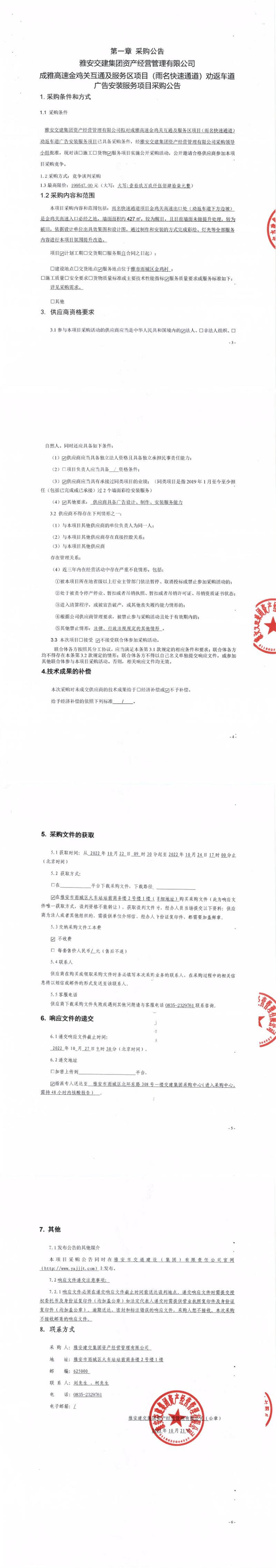 雅安交建集團(tuán)資產(chǎn)經(jīng)營管理有限公司成雅高速金雞關(guān)互通及服務(wù)區(qū)項(xiàng)目(雨名快速通道)勸返車道廣告安裝服務(wù)項(xiàng)目采購公告