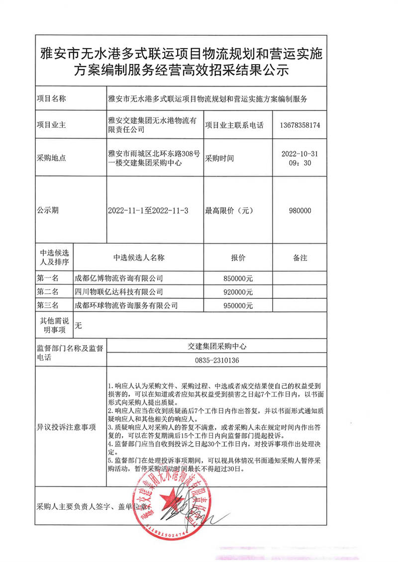 雅安交建集團(tuán)無水港物流有限責(zé)任公司雅安市無水港多式聯(lián)運(yùn)項(xiàng)目物流規(guī)劃和營(yíng)運(yùn)實(shí)施方案編制服務(wù)經(jīng)營(yíng)高效招采結(jié)果公示