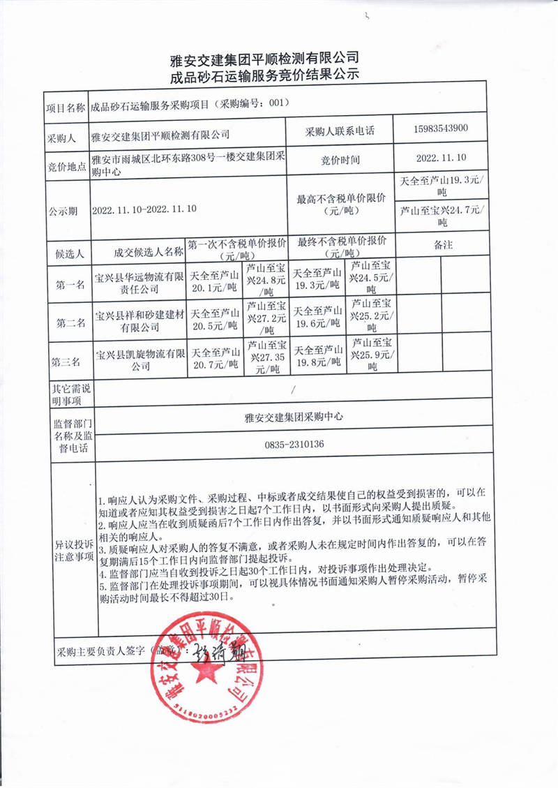 雅安交建集團平順檢測有限公司成品砂石運輸服務競價結果公示