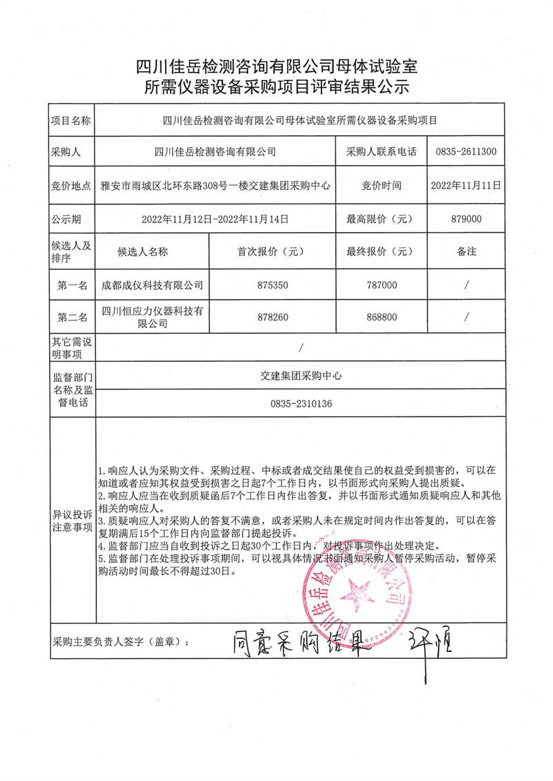 四川佳岳檢測咨詢有限公司母體試驗(yàn)室所需儀器設(shè)備采購項(xiàng)目評審結(jié)果公示