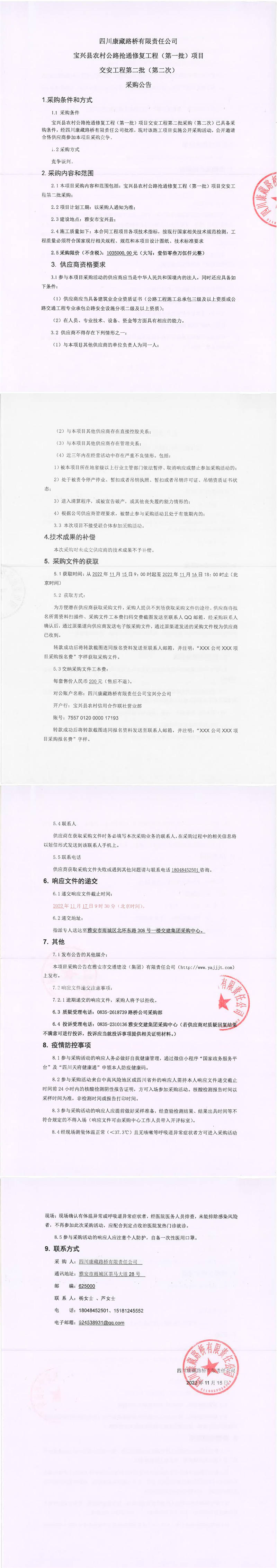 四川康藏路橋有限責任公司寶興縣農(nóng)村公路搶通修復工程(第一批)項目交安工程第二批采購(第二次)結果公示