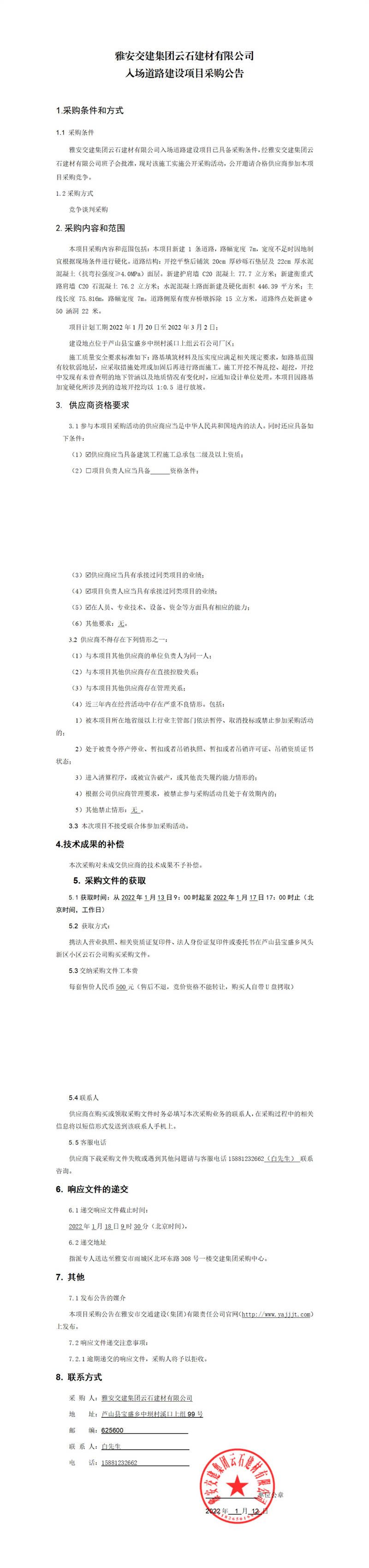 雅安交建集團云石建材有限公司入場道路建設項目采購公告