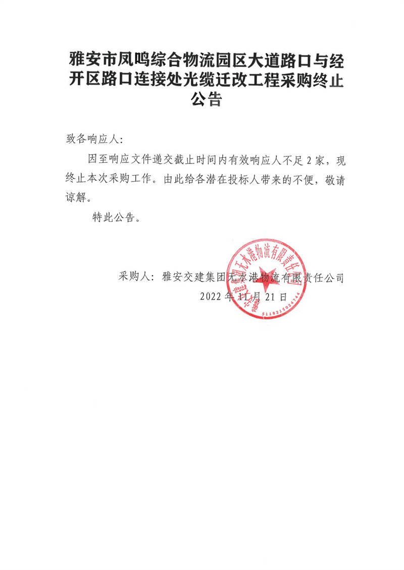 雅安交建集團(tuán)無水港物流有限責(zé)任公司雅安市鳳鳴綜合物流園區(qū)大道路口與經(jīng)開區(qū)路口連接處光纜遷改工程采購終止公告