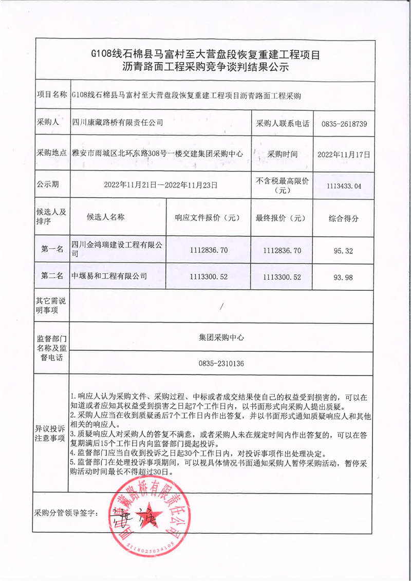 四川康藏路橋有限責(zé)任公司G108線石棉縣馬富村至大營盤段恢復(fù)重建工程項目瀝青路面工程采購競爭談判結(jié)果公示