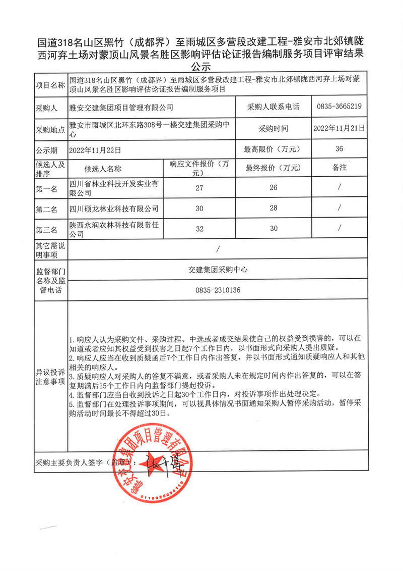 雅安交建集團項目管理有限公司國道318名山區(qū)黑竹(成都界)至雨城區(qū)多營段改建工程-雅安市北郊鎮(zhèn)隴西河棄土場對蒙頂山風景名勝區(qū)影響評估論證報告編制服務(wù)評審結(jié)果公示