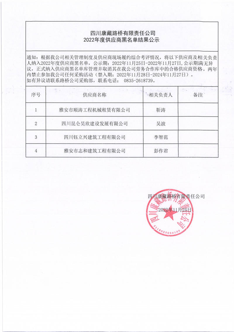 四川康藏路橋有限責(zé)任公司2022年度供應(yīng)商黑名單結(jié)果公示