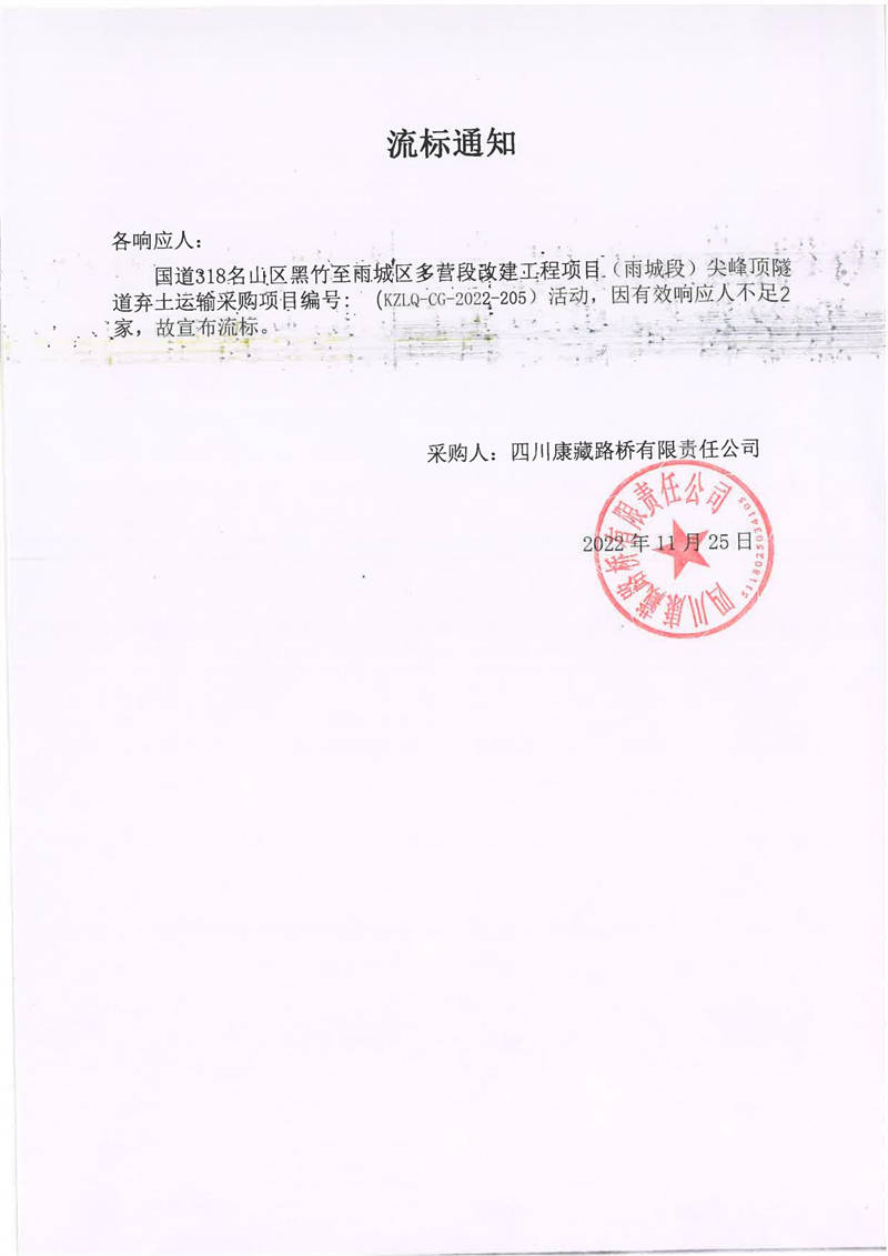 四川康藏路橋有限責(zé)任公司國道318名山區(qū)黑竹至雨城區(qū)多營段改建工程項目(雨城段)尖峰頂隧道棄土運輸采購項目流標(biāo)通知